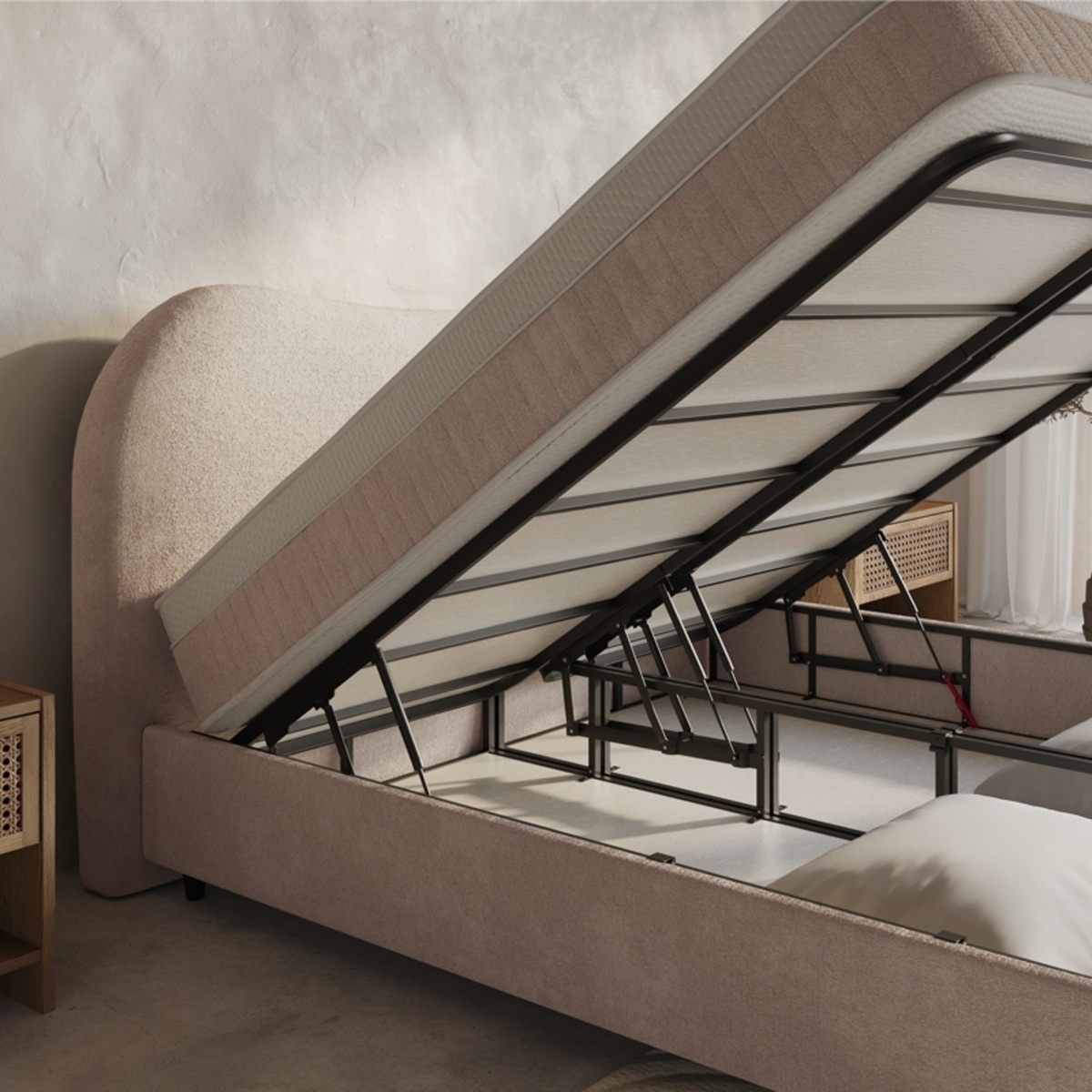Onder het ligoppervlak bevindt zich een ruime opbergruimte die eenvoudig toegankelijk is. Dit maakt de Dreamhouse Arcus bijzonder geschikt voor slaapkamers waar efficiënt gebruik van de beschikbare ruimte belangrijk is. Je bergt er moeiteloos beddengoed, seizoensartikelen of andere grote items in op.