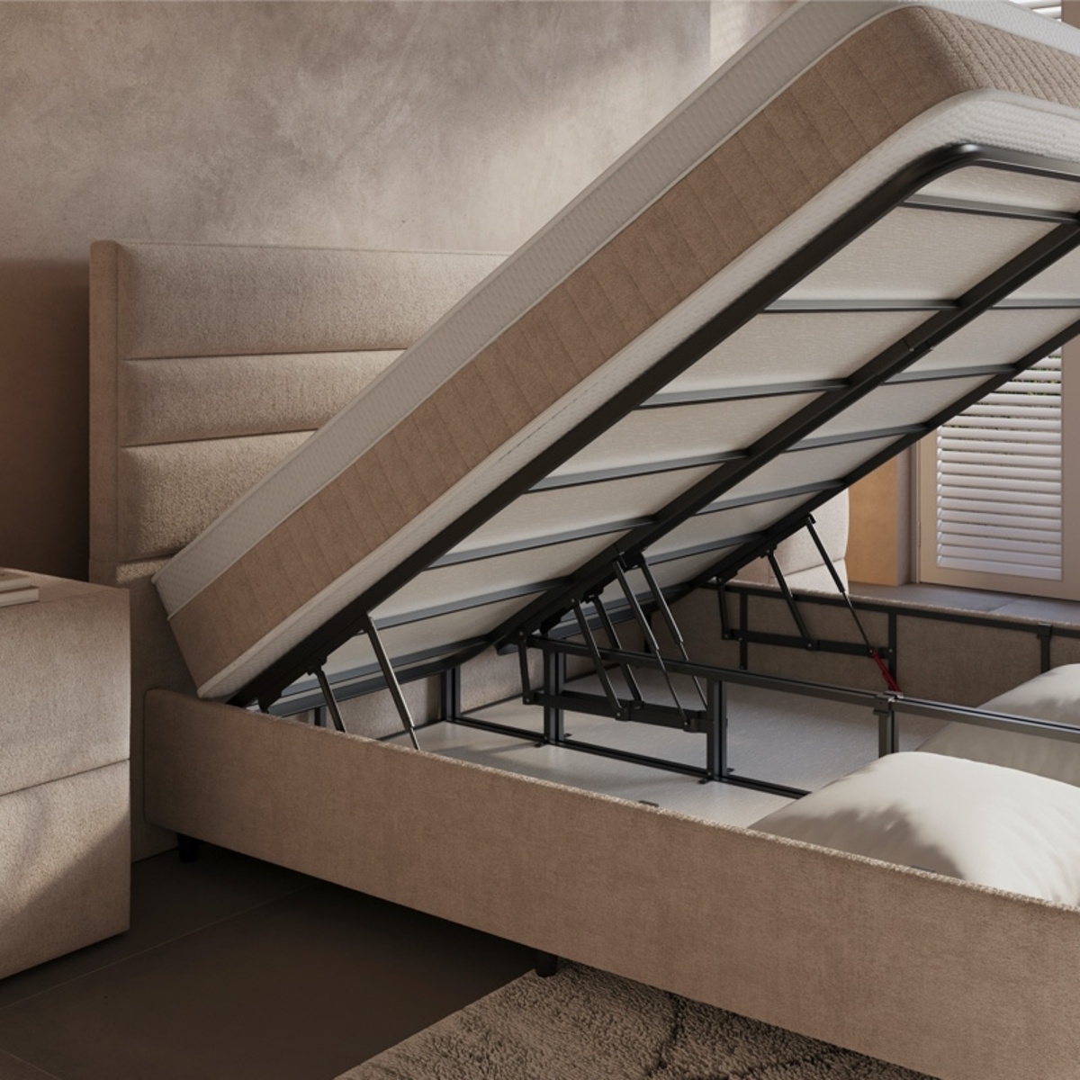 Onder het liggedeelte bevindt zich een ruime, geïntegreerde opbergruimte. Deze is eenvoudig toegankelijk en biedt volop plaats voor beddengoed, seizoensartikelen of andere grotere items. Zo benut je de ruimte in je slaapkamer optimaal zonder extra kasten toe te voegen.