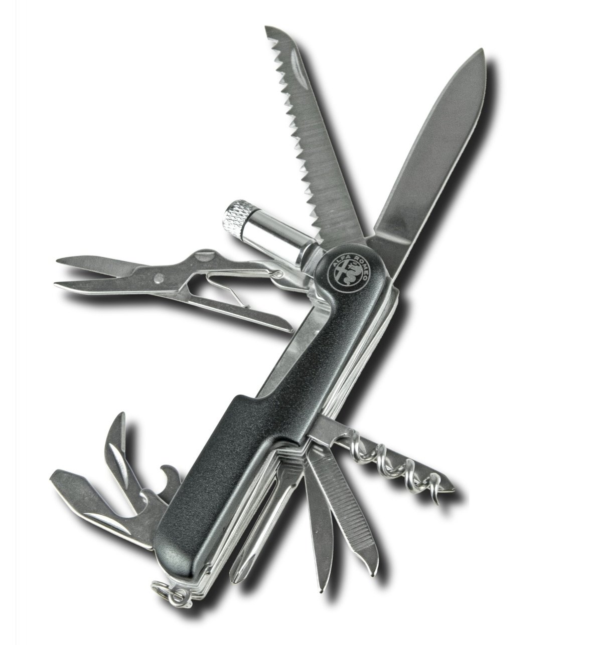 Het 14-in-1 zakmes van Alfa Romeo is een echte alleskunner. Van zaag tot LED-lamp en van flesopener tot schroevendraaier – alles in één compact en lichtgewicht gereedschap dat altijd van pas komt.