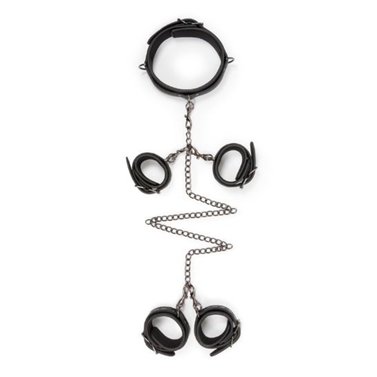 Fetish set met halsband, enkelboeien en handboeien set! Hij bestaat uit een halsband, handboeien en enkelboeien die gemakkelijk van elkaar gescheiden k – Praktisch en betrouwbaar in dagelijks gebruik