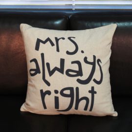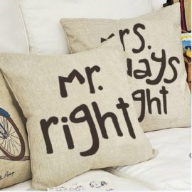 Verras je partner met deze leuke originele kussens! Deze kussens met de tekst “Mr right” en “Mrs always right” zijn zonder en met binnenkussen verkrijgbaar. Leuk voor op de bank en met de kleur grijs/beige passen ze bijna overal bij. Je kunt nooit genoeg sierkussens op de bank hebben. De tekst Mr right en Mrs always right zullen veel vrouwen aanspreken. Leuk als cadeau maar ook leuk voor je zelf.
