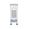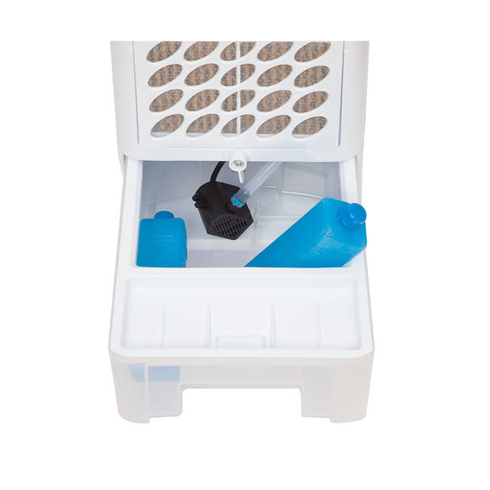 Je vult de aircooler met water of ijs (3 liter) en in de luchtkoeler wordt dit water langs een rooster geleid. Door dit rooster wordt het water verdampt en wordt de lucht sterk gekoeld. Door de waterdamp wordt de ruimte ook vochtig en dient een aircooler dus ook als luchtbevochtiger. Twee vliegen in één klap!