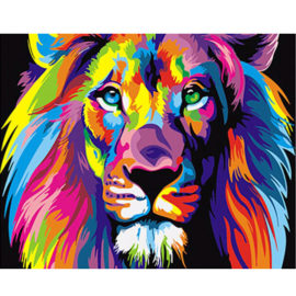 De leeuw is de koning der dieren. Door zijn imposante uiterlijk staat de leeuw veel afgebeeld op de wapens van landen, streken of steden. De leeuw leeft in Afrika maar ook in een klein gedeelte van India. Wist je dat de leeuw de enige katachtige is die in sociale groepen leeft? Op het doek van schilderen op nummers zie je een imposante leeuw met felle fantasie kleuren. Maar de leeuw is duidelijk herkenbaar. De kleuren maken van dit schilderij een uniek ontwerp. Kortom een leuk paint by numbers project die je tot laat in de avonduren bezig kunnen houden. Durf jij deze uitdaging aan?