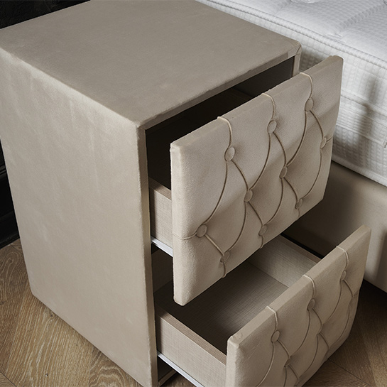 - Optionele bijpassende accessoires: Nachtkastje 2 lades in zelfde stoffering