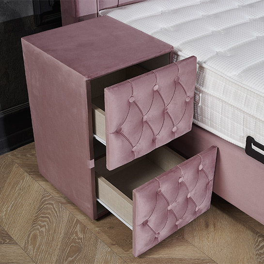 - Optionele bijpassende accessoires: Nachtkastje 2 lades in zelfde stoffering