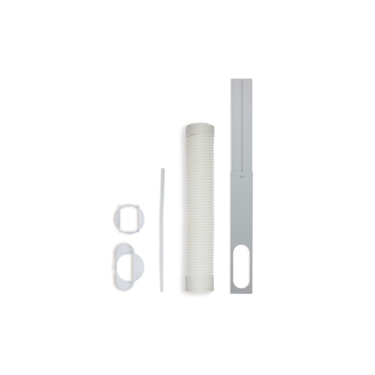 - Een raam of deur naar buiten is benodigd om de slang naartoe te begeleiden, zodat de warme lucht naar buiten gebracht kan worden – de afvoerslang is 150 cm en mag niet verlengd worden