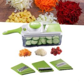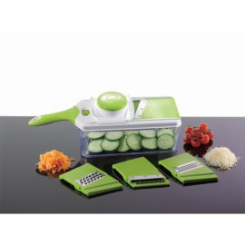 De vier verwisselbare inzetstukken zorgen voor een enorme keuzemogelijkheid wat betreft de bereiding van je voedsel. Daarbij kun je door middel van de schakelaar de dikte van de plakjes bepalen. Snijd of rasp je voedsel dus precies zoals je het wilt! Het voedsel valt na het snijden direct in de opvangbak, zo blijft je keuken schoon en bespaar je tijd. De snijbeschermer zorgt voor een optimale veiligheid. Het soft handvat biedt een anti-slip bescherming. Daarnaast is de bodem voorzien van anti-slip noppen.