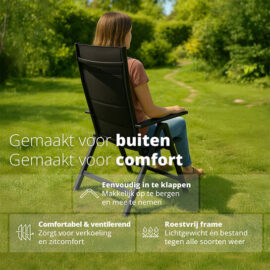 De FlinQ Vylora tuinstoelen zijn ontworpen voor wie op zoek is naar comfort Γ©n gemak. Met een 6-voudig verstelbare rugleuning stem je de zithouding af op jouw behoefte β van rechtop zitten tot volledig relaxen. Dankzij het zachte hoofdkussen met dubbele textileenlaag en vulling, ervaar je maximale ondersteuning. Het robuuste aluminium frame is lichtgewicht en weerbestendig, terwijl de ademende zitting plakken voorkomt op warme dagen. Perfect voor tuinliefhebbers, kampeerders, terrasgangers en iedereen die comfort waardeert in de buitenlucht.