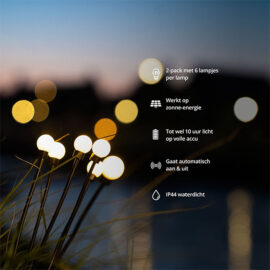 Wil je je tuin, balkon of terras een vrolijke en sprookjesachtige sfeer geven? Dan is de FlinQ Tiara – Solar tuinverlichting iets voor jou! Deze tuinlampen bestaan uit 10 lampjes op flexibele draadjes, die meebewegen met de wind. De lampjes werken op zonne-energie en hebben een intelligente sensor die ze automatisch aan- of uitschakelt als het donker of licht wordt. Je krijgt twee lampen in een pakket, die je makkelijk in de grond kunt steken met de meegeleverde grondpennen. De lampjes geven een warmwit licht, dat je tuin een gezellige en romantische uitstraling geeft. De lampjes zijn ook waterdicht en kunnen het hele jaar door gebruikt worden.