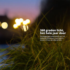 De FlinQ Tiara – Solar tuinverlichting heeft vele voordelen ten opzichte van andere tuinlampen. Ten eerste bespaar je op je energierekening, want de lampjes hebben geen stroomkabels of batterijen nodig. De lampjes laden zichzelf op met het zonlicht en hebben een oplaadbare Ni-Mh batterij die tot 10 uur mee kan gaan op een volle lading. Als de lampjes leeg zijn, laden ze de volgende dag vanzelf weer op. Ten tweede heb je meer gemak van de lampjes dankzij de sensor. Je hoeft niet steeds op te staan om het licht aan of uit te doen, want de lampjes doen dat zelf. De lampjes schakelen automatisch over van aan naar uit als het licht of donker wordt. Zo kun je altijd genieten van het licht als je het nodig hebt. Ten derde heb je meer plezier van de lampjes dankzij het flexibele ontwerp. De lampjes hebben een draadloos ontwerp en zijn voorzien van flexibele draadjes, die zorgen voor een speels en dynamisch effect. De lampjes bewegen mee met de wind, waardoor ze lijken op vuurvliegjes of sterren. De lampjes hebben ook een stralingshoek van 360 graden, waardoor ze je tuin van alle kanten verlichten.