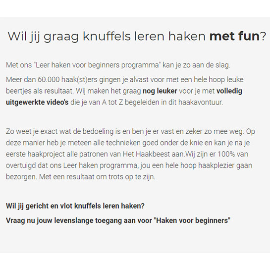 Zo weet je exact wat de bedoeling is en ben je er vast en zeker zo mee weg. Op deze manier heb je meteen alle technieken goed onder de knie en kan je na je eerste haakproject alle patronen van Het Haakbeest aan. Wij zijn er 100% van overtuigd dat ons Leer haken programma, jou een hele hoop haakplezier gaan bezorgen. Met een resultaat om trots op te zijn.