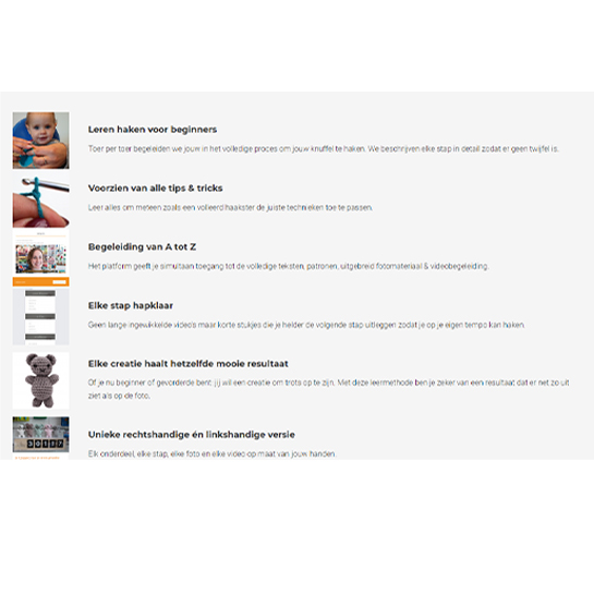 Elke stap hapklaar. Geen lange ingewikkelde video’s maar korte stukjes die je helder de volgende stap uitleggen zodat je op je eigen tempo kan haken.