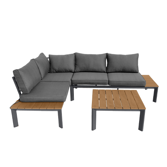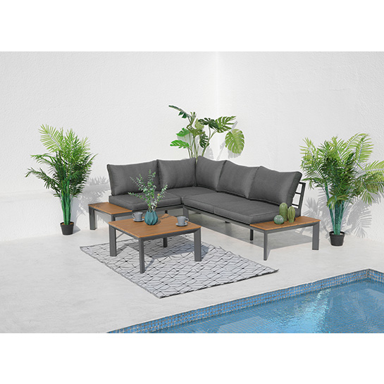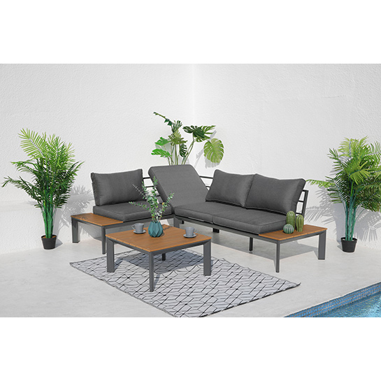 - Luxe Uitstraling: Dankzij de combinatie van hout, antraciet aluminium en grijze kussens.