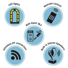 De retro Vintage Vinyl jukebox heeft ontzettend goede ingebouwde stereo luidsprekers, dit zorgt voor een prachtig geluid waar je wel urenlang naar kunt luisteren. De buitenste rand van de jukebox is voorzien van LED lights in verschillende kleuren. De jukebox heeft twee AUX-ingangen, hierdoor kun je gemakkelijk apparaten (zoals je telefoon of tablet) aansluiten en muziek gaan afspelen. Je kunt ook externe speakers aansluiten via de AUX-ingangen voor extra geluid. Je kunt er natuurlijk ook voor kiezen je apparaat te koppelen via de Wireless bluetooth connection. Zodra de apparaten met elkaar in contact zijn kun jij genieten van je muziek. De jukebox heeft ook een afstandsbediening, hiermee kun je de jukebox gemakkelijk van afstand bedienen.