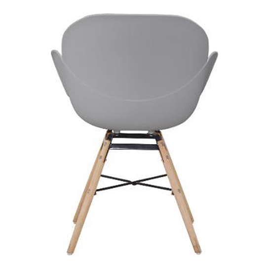 De zijdelings gespreide houten poten zijn verbonden door stijlvolle metalen stutten en zorgen voor een stabiele stand. Het zitgedeelte bestaat uit één stuk en is zeer onderhoudsvriendelijk. Het gemakkelijk te reinigen oppervlak maakt de stoelen ideaal voor de keuken of eetkamer.