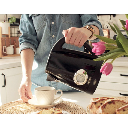 - Gebruiksgemak in alle opzichten – de waterkoker is draadloos en kan 360° draaien op de basis, waardoor hij makkelijk te hanteren is voor zowel links- als rechtshandigen. Het verwarmingselement is verborgen, wat het koken versnelt en het schoonmaken vergemakkelijkt. Het deksel kan kantelen, zodat je het water eenvoudig en veilig kunt bijvullen. Het mechanisme is simpel en betrouwbaar.