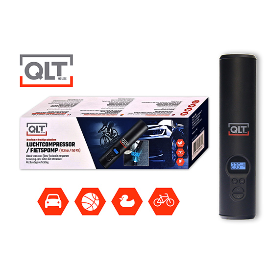 De QLT compressor wordt geleverd met vier verschillende opzetstukken en is daardoor te gebruiken voor veel verschillende voorwerpen. Het is ideael voor alles wat lucht nodig heft, denk bijvoorbeeld aan een luchtbed wat normaal met de mond opgeblazen moet worden. Ook tijdens fietstochten kan dit draadloze apparaat goed van pas komen en sta je nooit meer met zachte banden.