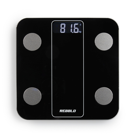 De Rebblo slimme weegschaal heeft een zwart design en is voorzien van 5 mm dik gehard glas. De weegschaal is te gebruiken met meerdere gezinsleden, die ook via de app toegang hebben tot hun voortgang. De maximale capaciteit is 180 KG.