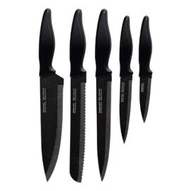 - Anti-aanbaklaag: De messen hebben een anti-aanbaklaag, die voorkomt dat voedsel aan het oppervlak blijft plakken. Dit maakt het snijden makkelijker en sneller, en vermindert ook de kans op bacteriën en voedselverspilling.