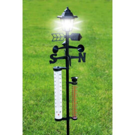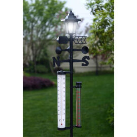De regenmeter en thermometer bestaat uit een metalen staaf met verschillende onderdelen. Aan de bovenkant zit een lantaarn die werkt op zonne-energie en die automatisch oplicht in het donker. De lantaarn heeft een batterij die tot 8 uur lang kan branden. Zo kun je ook ‘s avonds genieten van de sfeervolle verlichting in je tuin.