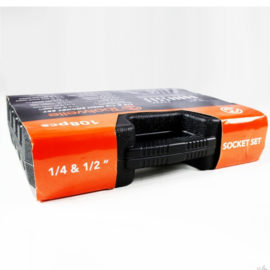 Iedere tool voorzien van 1/4″ of 1/2″ aansluiting gefabriceerd uit hoogwaardig Chroom Vanadium en molybdeenstaal. Uiteraard wordt er voldaan aan de hoogste eisen en aan de geldende DIN-normen. De doppen zijn van het flankensysteem, dat wil zeggen dat ze de flank van de bout of moer pakken in plaats van de hoeken, dit voorkomt het kapot draaien van vastgeroeste moeren en bouten. Kortom een enorme set die breed inzetbaar is en voorzien is van alle gangbare maten. En om het geheel compleet te maken heeft men verrassend genoeg nog plaats gevonden om deze enorme koffer te voorzien van diverse verlengstukken, adapters, cardanstukken en een 1/4 inch schroevendraaier, zodat ook de moeilijk bereikbare plaatsen voor jou kinderspel zijn. Het geheel is overzichtelijk vastgeklikt in deze overvolle koffer zodat je altijd snel de juiste tool kunt vinden. Een completere set zul je niet snel vinden zeker niet van deze kwaliteit.