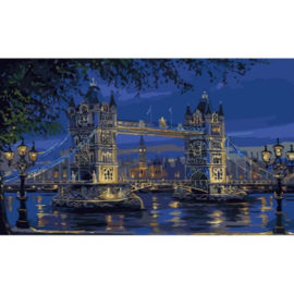 De Tower Bridge is tegenwoordig een van de toeristische attractieās van London en is dagelijks te bezichtigen. Het canvasdoek laat London bij avond zien, de lichten en de lantaarns branden en hierdoor ontstaat een sfeervol beeld.