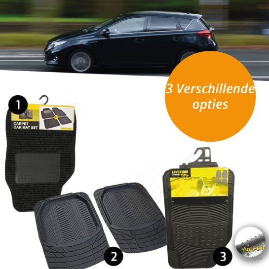 Een universele mattenset vervaardigd van duurzaam en waterdicht rubber. De matten passen in elke auto, maar omdat niet iedere auto hetzelfde is, zijn deze matten naar wens op maat te snijden. Je kunt er dus zelf de nodige vorm aan geven en de matten voorzien van de uitsparingen die je auto nodig heeft. Deze rubberen matten zijn eenvoudig schoon te maken en geeft de binnenkant van de auto een enorm stoere look. Ook deze matten hebben aan de boven- en onderkant een anti-slip laag.