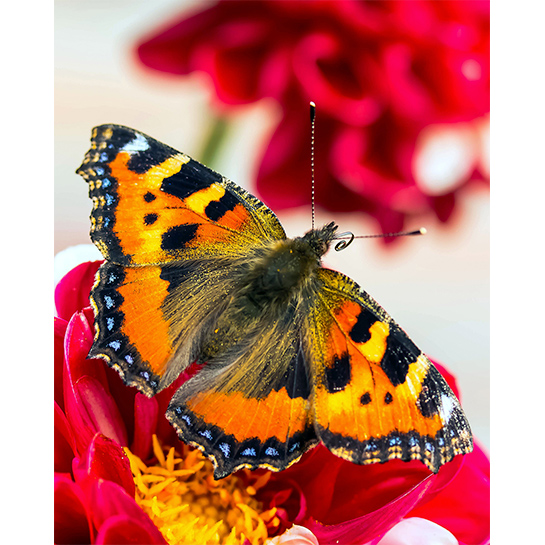 Deze vlinder de kleine vos kun je in Nederland tegenkomen. De kleine vos komt voor in heel Europa en het noordelijk deel van het Arabisch Schiereiland tot Siberië, China en Japan. De kleine vos heeft een voorvleugellengte van 22 tot 25 millimeter. De basiskleur van de bovenkant van de vleugels is oranje. Een mooie vlinder om te schilderen. Op het schilderen op nummers doek zie je één vlinder en op de achtergrond zie twee mooie rode bloemen. Een mooi project, waarmee je uren zoet mee bent.
