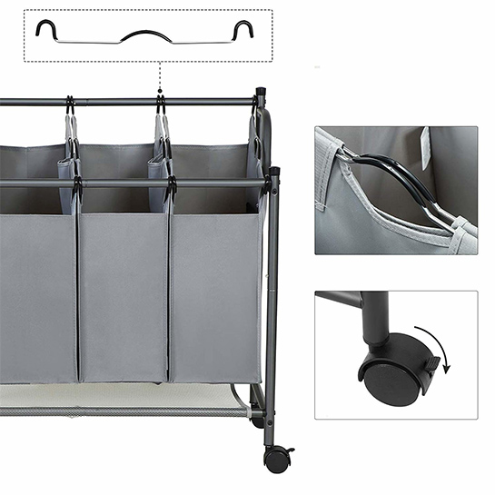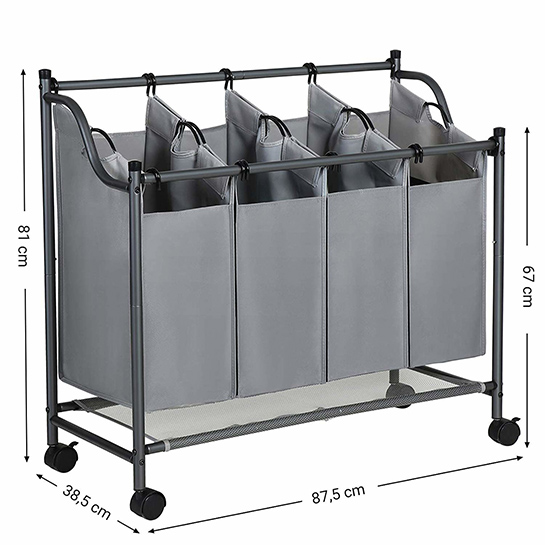 De 4 elegante grijze stoffen tassen kunnen individueel worden verwijderd en zijn gemakkelijk te vervoeren dankzij de praktische handgrepen. Je hoeft nu niet meer de hele wasmand naar de wasmachine te dragen.