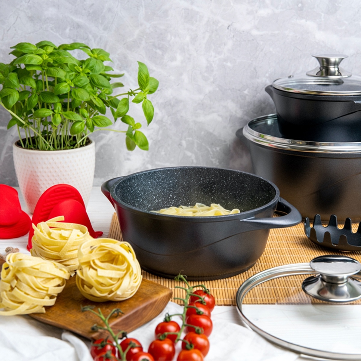 Met deze pannenset kies je voor eenvoud, onderhoudsgemak en veelzijdigheid. Je kookt efficiënt op elke kookplaat, bespaart tijd bij het schoonmaken en hebt een complete set voor dagelijks gebruik. Een praktische en stijlvolle keuze voor elke keuken.