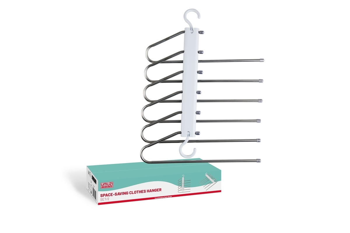Dankzij het strakke ontwerp in wit en zilver passen de hangers moeiteloos in elke kast, van moderne slaapkamers tot compacte studentenkamers. De set bestaat uit twee multifunctionele hangers die zowel horizontaal als verticaal te gebruiken zijn.